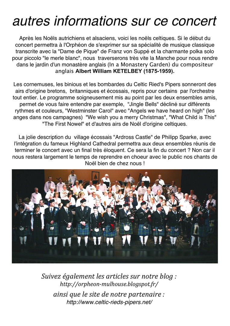 Les compositeurs appréciés par le grand organiste Schweitzer, Jean-Sébastien Bach, Charles-Marie Widor, Antonio Vivaldi et Richard Wagner, seront mis en lumière par les musiciens amateurs passionnés et talentueux de l’Orphéon. L’esprit positif singulier d’Albert Schweitzer, dans toutes les circonstances de sa vie, sera traduit par la flûte solo de Patricia avec « Menuet et Badinerie » de Bach. La magnificence des œuvres sera assurée par les trompettistes Olivier et David, interprétant en solistes le concerto pour deux trompettes de Vivaldi.